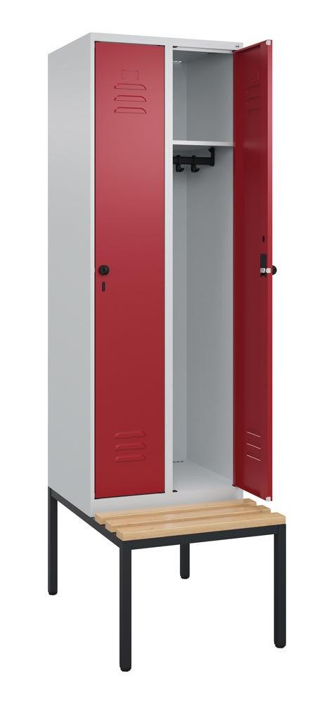 Garderobenschrank, untergeb. Sitzbank, BxTxH 600x500x2120 mm, 2 Abteile, Abt.B 300 mm, Holzleisten, Drehriegel, Farbwahl