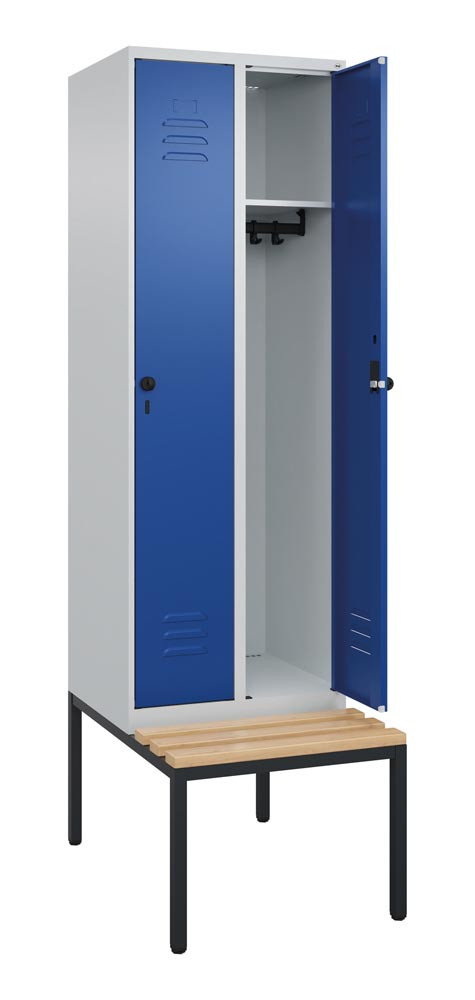 Garderobenschrank, untergeb. Sitzbank, BxTxH 600x500x2120 mm, 2 Abteile, Abt.B 300 mm, Holzleisten, Drehriegel, RAL 7035/5010