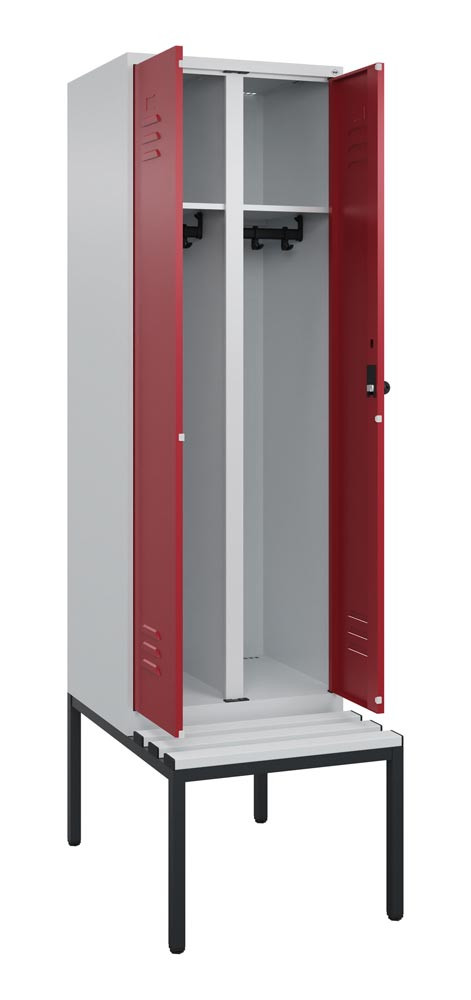 Garderobenschrank, untergeb. Sitzbank, BxTxH 600x500x2120 mm, 2 Abteile, Abt.B 300 mm, Kunststoffleisten, Drehriegel, Farbwahl
