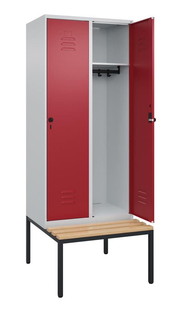 Garderobenschrank, untergeb. Sitzbank, BxTxH 800x500x2120 mm, 2 Abteile, Abt.B 400 mm, Holzleisten, Drehriegel, Farbwahl