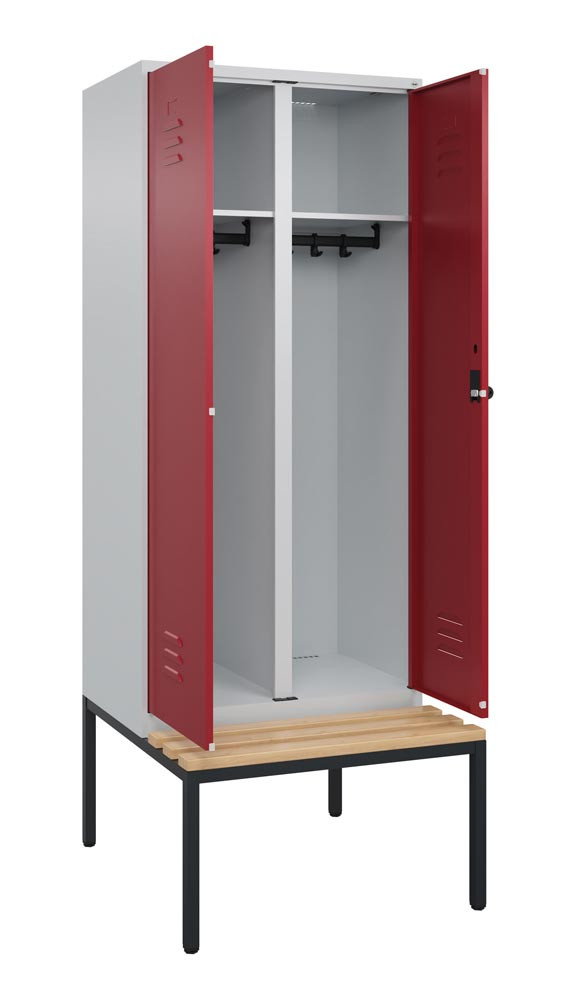 Garderobenschrank, untergeb. Sitzbank, BxTxH 600x500x2120 mm, 2 Abteile, Abt.B 300 mm, Holzleisten, Drehriegel, Farbwahl E6476241
