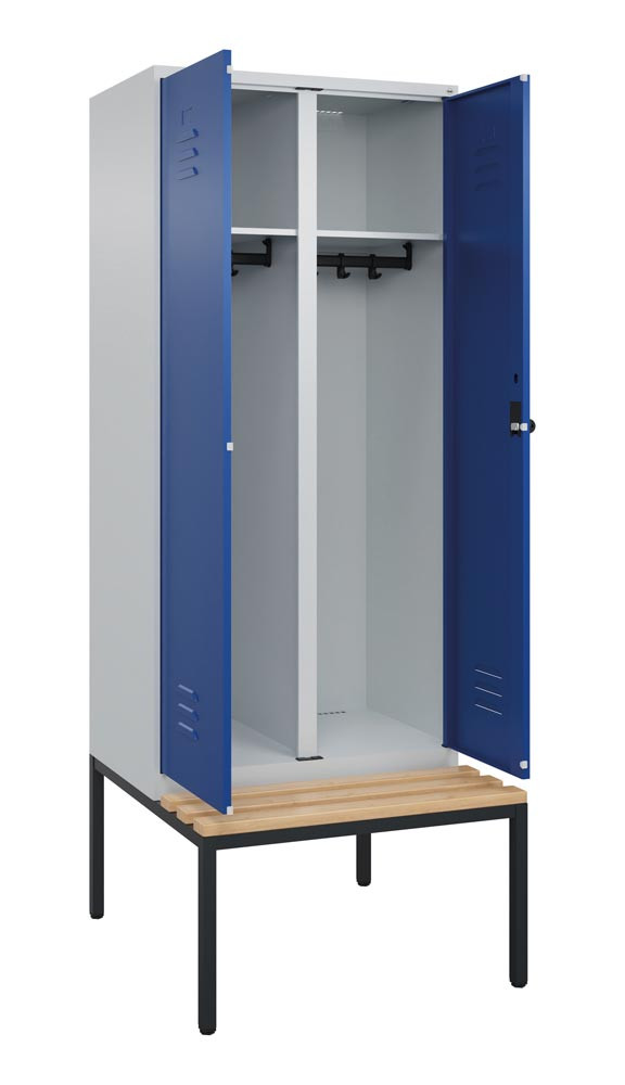 Garderobenschrank, untergeb. Sitzbank, BxTxH 600x500x2120 mm, 2 Abteile, Abt.B 300 mm, Holzleisten, Drehriegel, RAL 7035/5010 E6476240
