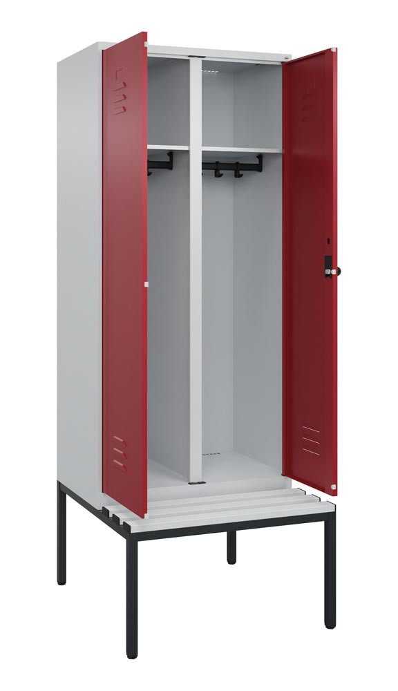 Garderobenschrank, untergeb. Sitzbank, BxTxH 600x500x2120 mm, 2 Abteile, Abt.B 300 mm, Kunststoffleisten, Drehriegel, Farbwahl E6476250