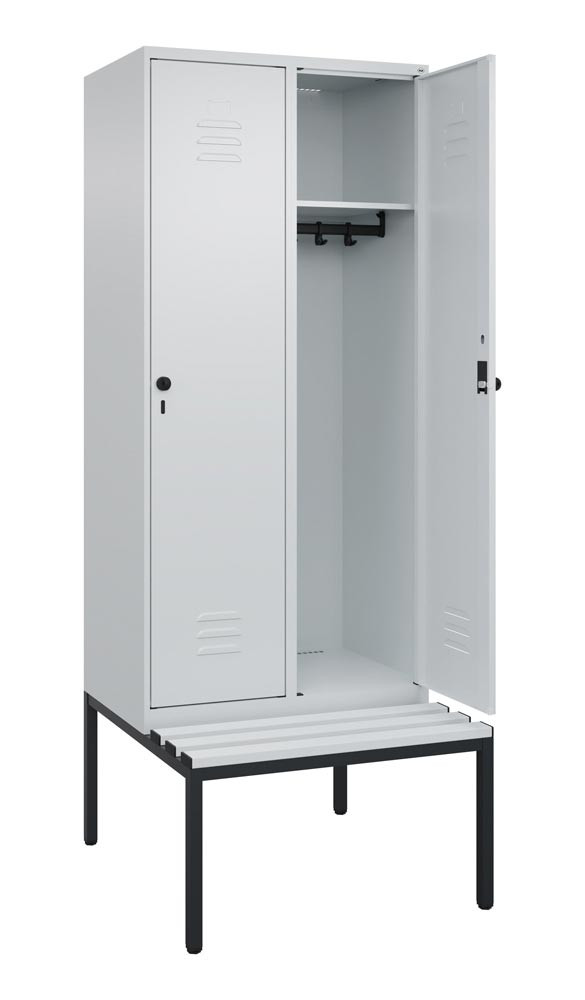 Garderobenschrank, untergeb. Sitzbank, BxTxH 800x500x2120 mm, 2 Abteile, Abt.B 400 mm, Kunststoffleisten, Drehriegel, RAL 7035