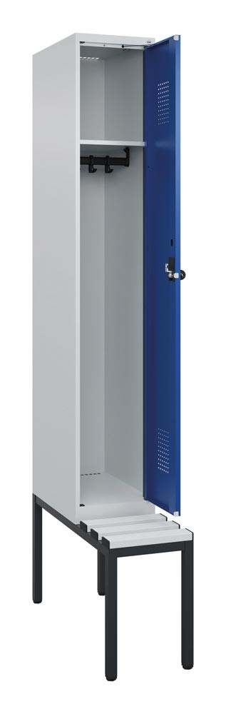 Garderobenschrank, untergeb. Sitzbank, Kunststoff-Sitzleisten, 1 Abteil, Abt.B 300 mm, Drehriegel, BxTxH 300x500x2120 mm, RAL 7035/5010 E6476613