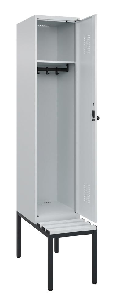 Garderobenschrank, untergeb. Sitzbank, Kunststoff-Sitzleisten, 1 Abteil, Abt.B 300 mm, Drehriegel, BxTxH 300x500x2120 mm, RAL 7035 E6476612