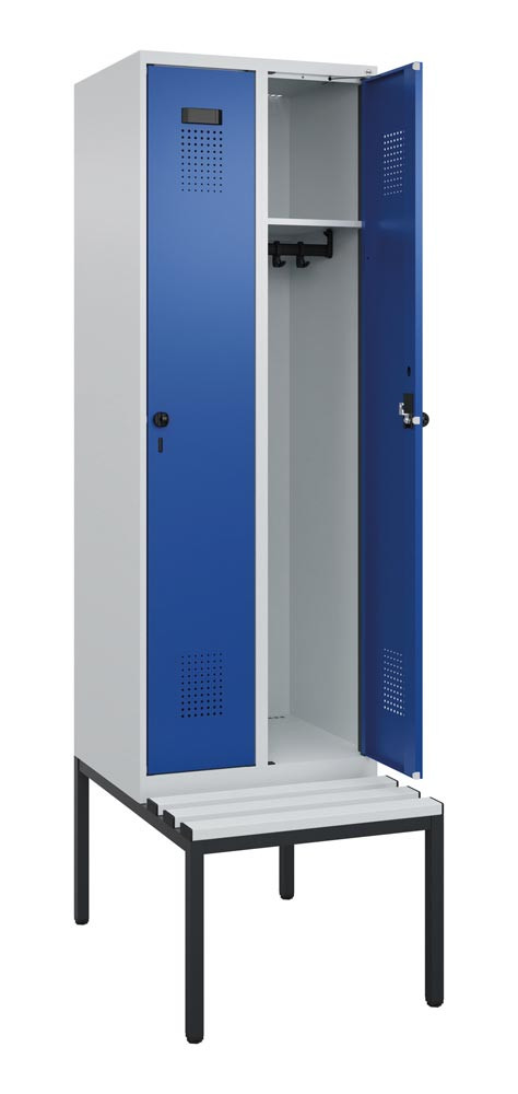 Garderobenschrank, untergeb. Sitzbank, Kunststoff-Sitzleisten, 1 Abteil, Abt.B 400 mm, Drehriegel, BxTxH 400x500x2120 mm, RAL 7035/5010 E6476616