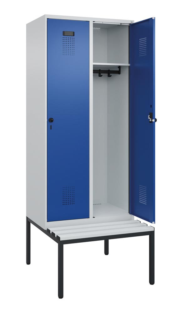 Garderobenschrank, untergeb. Sitzbank, Kunststoff-Sitzleisten, 1 Abteil, Abt.B 300 mm, Drehriegel, BxTxH 300x500x2120 mm, RAL 7035/5010 E6476613