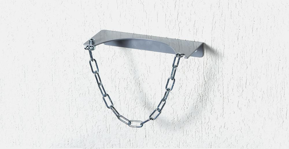 ∙ Stabile Stahlblechkonstruktion, feuerverzinkt ∙ Mit Kettensicherung und Bohrungen zur Wandbefestigung