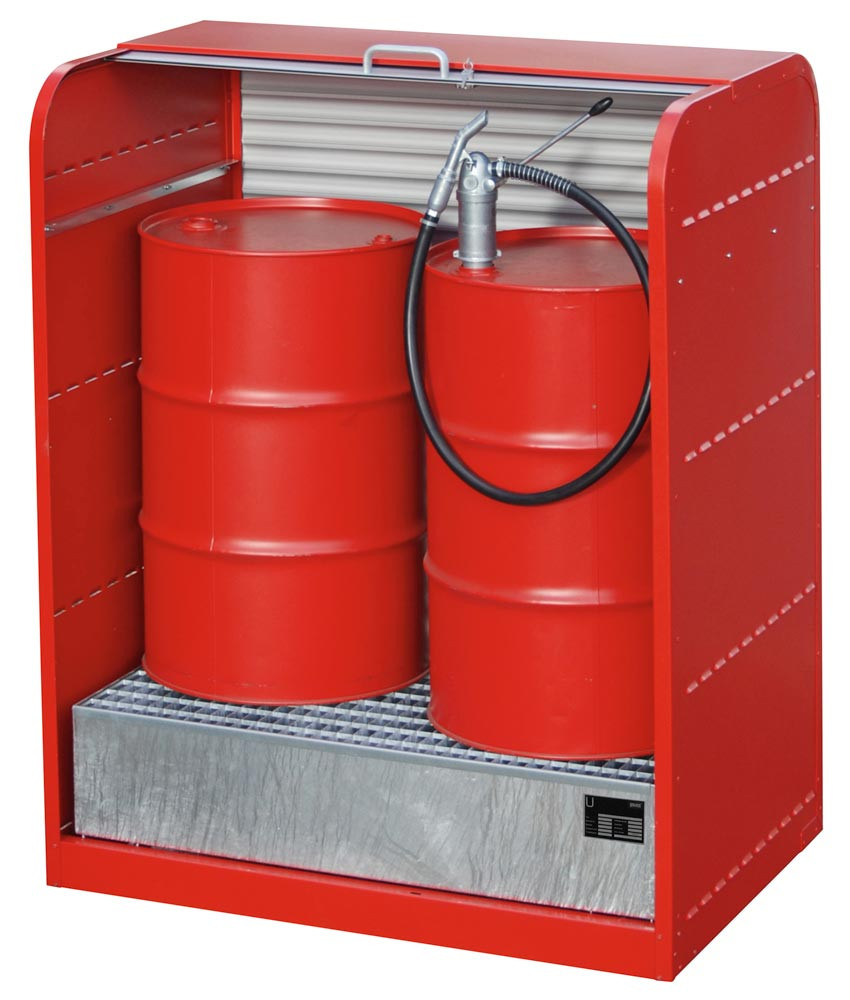 Gefahrstoff-Depot für 2x200 l Fässer, BxTxH 1300x870x1610 mm, 1 Wanne Volumen 215 l, Rolllade, RAL 5012 E1987230