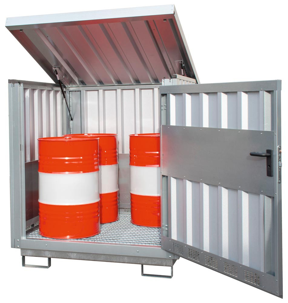 · Für den Innen- und Aussenbereich geeignet · Zur passiven Lagerung · Auffangwannen aus 3 mm Stahlblech · Verzinkter Gitterrost, Traglast 1000 kg / m2 · Geschlossene Ausführung aus verzinktem, profiliertem Stahlblech · Natürlicher Luftwechsel · Abschließbar