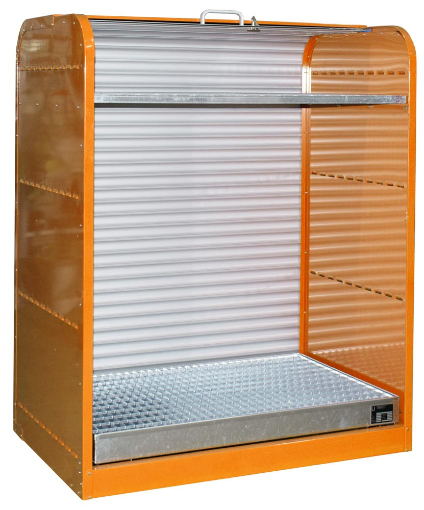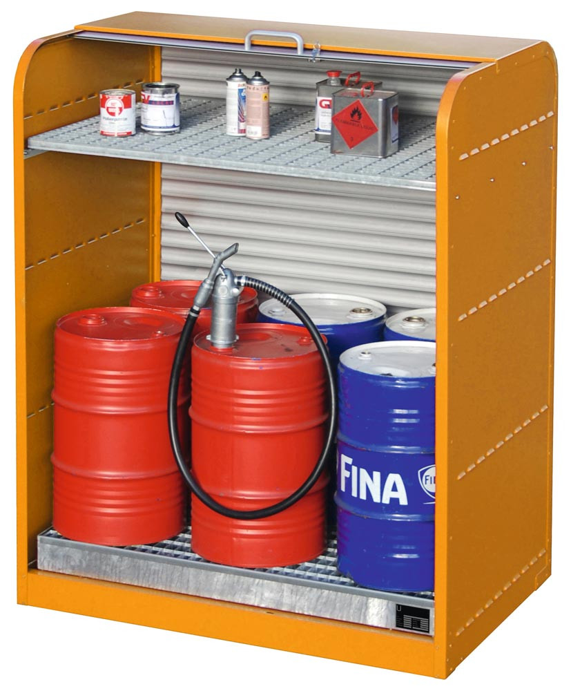 Gefahrstoff-Depot für 6x60-l-Fässer, BxTxH 1300x870x1610 mm, 1 Wanne, 1 Gitterrost, Vol. 73 l, Rolllade, RAL 2000 E1987231