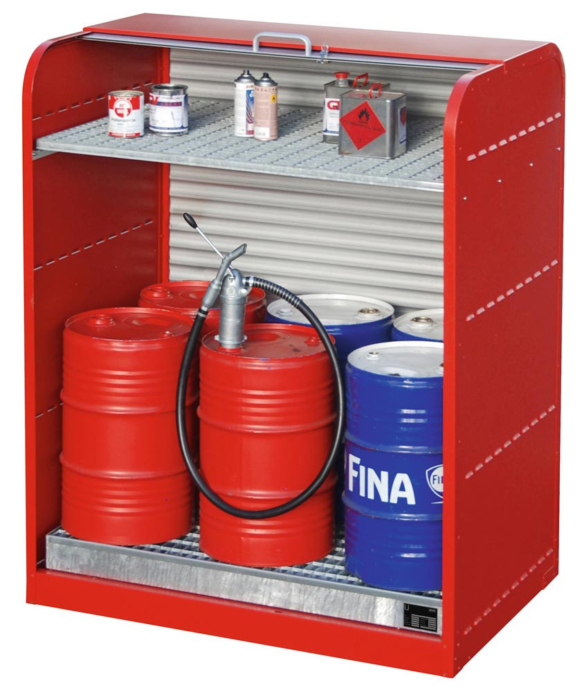 Gefahrstoff-Depot für 6x60-l-Fässer, BxTxH 1300x870x1610 mm, 1 Wanne, 1 Gitterrost, Vol. 73 l, Rolllade, RAL 3000 E1987232
