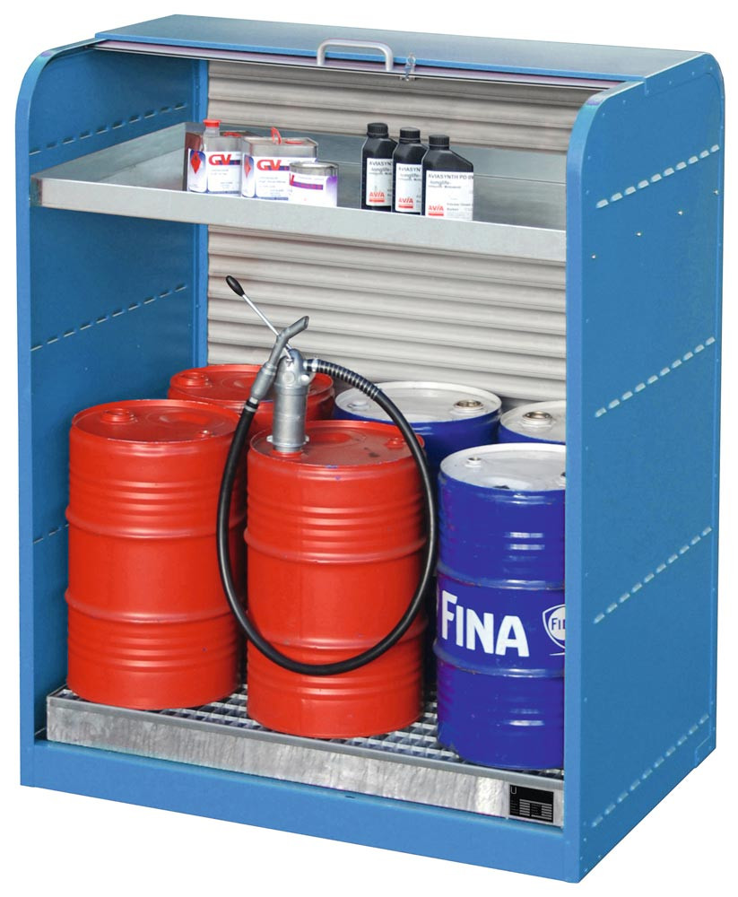 Gefahrstoff-Depot für 2x200 l Fässer, BxTxH 1300x870x1610 mm, 1 Wanne Volumen 215 l, Rolllade, RAL 5012 E1987230