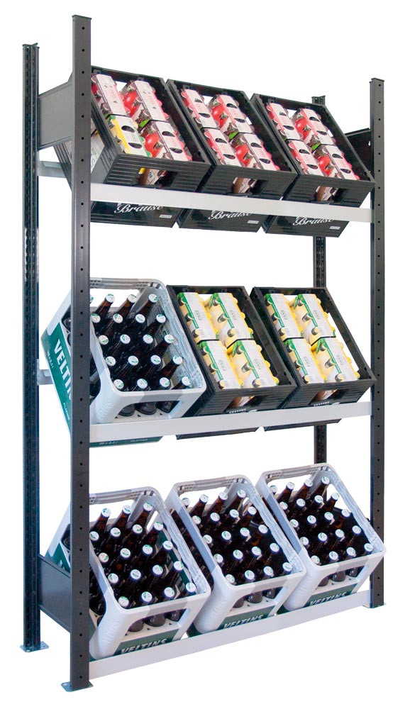 · Zur schrägen und übersichtlichen Lagerung unterschiedlicher Getränkekisten · Schneller Aufbau durch einfaches Stecken der Ebenen · Extrem robust mit einer Belastbarkeit bis 60 kg pro Ebene