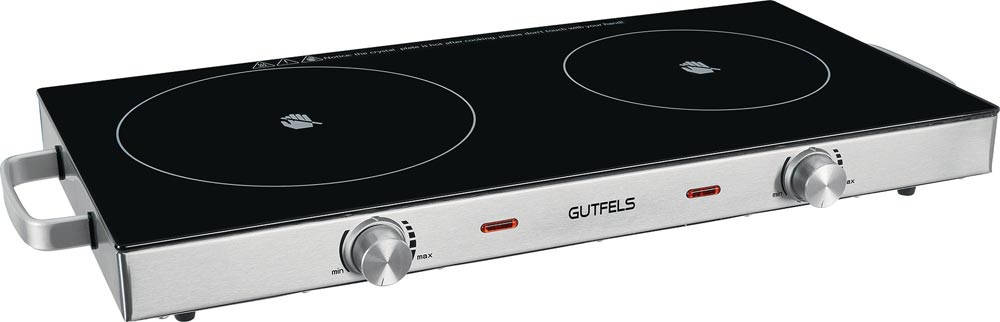 1800 + 1000 Watt Leistung · 2 Kochzonen Ø 20,0 cm und Ø 16,5 cm · stufenlose Temperaturregelung mit Kontrollleuchten · Überhitzungsschutz