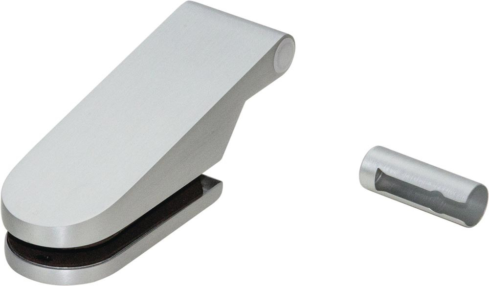 Glastürband mit halbkreisförmigem Bandende, zur Glasmitte zeigend · max. 45 kg Flügelgewicht und max. 1000 mm Flügelbreite · Material Aluminium · für ESG 8 mm Glasdicke und 24 mm Falztiefe bzw. für 10 mm Glasdicke und 26 mm Falztiefe · Band Abmessungen (BxH) 131 x 43 mm · mit Hülse · 2-teilig