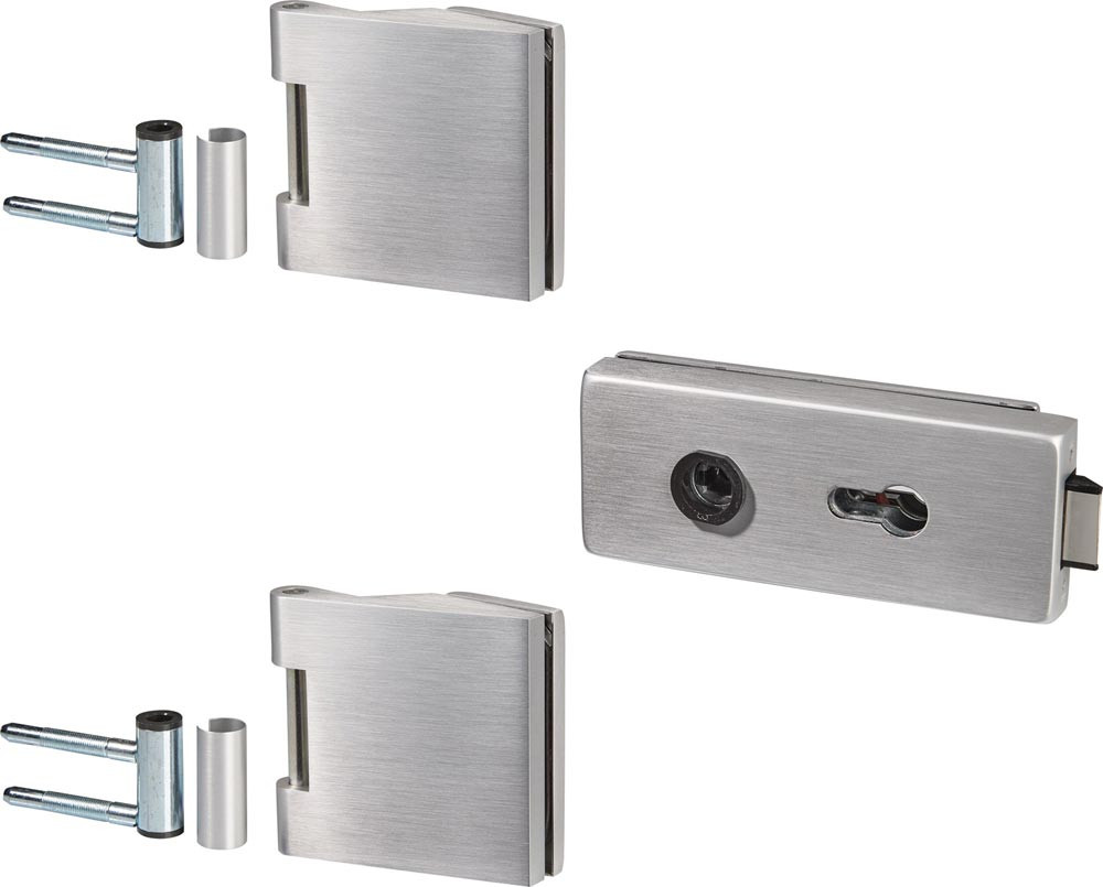 mit rechteckigem Kappenende, zur Glasmitte zeigend · für 8 mm Glasdicke und 24 mm Falztiefe bzw. für 10 mm Glasdicke und 26 mm Falztiefe · DIN links / rechts verwendbar · Material Aluminium · für ESG 8 bzw. 10 mm · max. Türflügelgewicht: 60 kg / 80 kg (OFFICE Bänder) · Schlosskasten Abmessungen (BxHxT): 165x65x37 mm · Schloss nach DIN 18 251, Klasse 3 (200.000 Betätigungen der Fallenfunktion und 50.000 Betätigungen des Riegels, bei fest montiertem Beschlag nach DIN 18 257) · Einsatzbereich für 1-/2-flügelige Anlagen oder Anlagen mit Seitenteil · mit Drückerführung · ohne Drücker