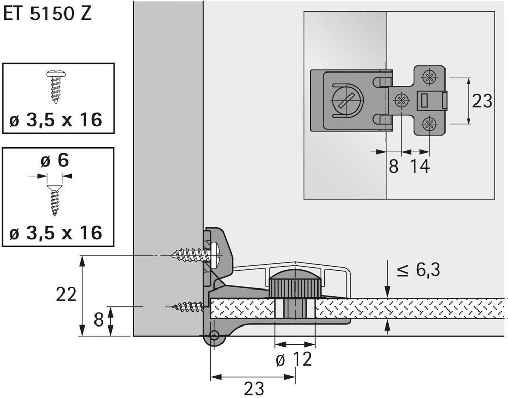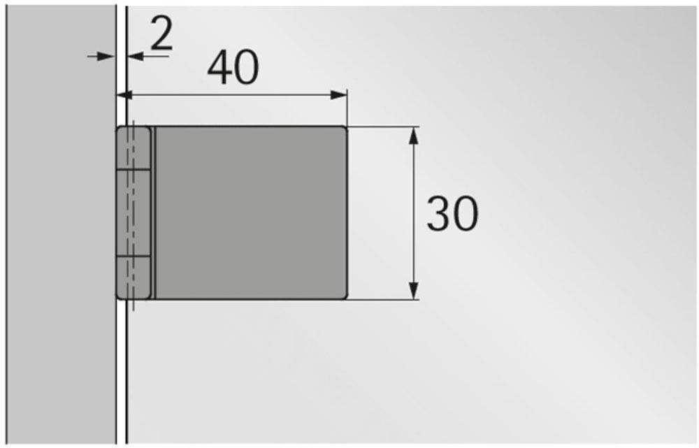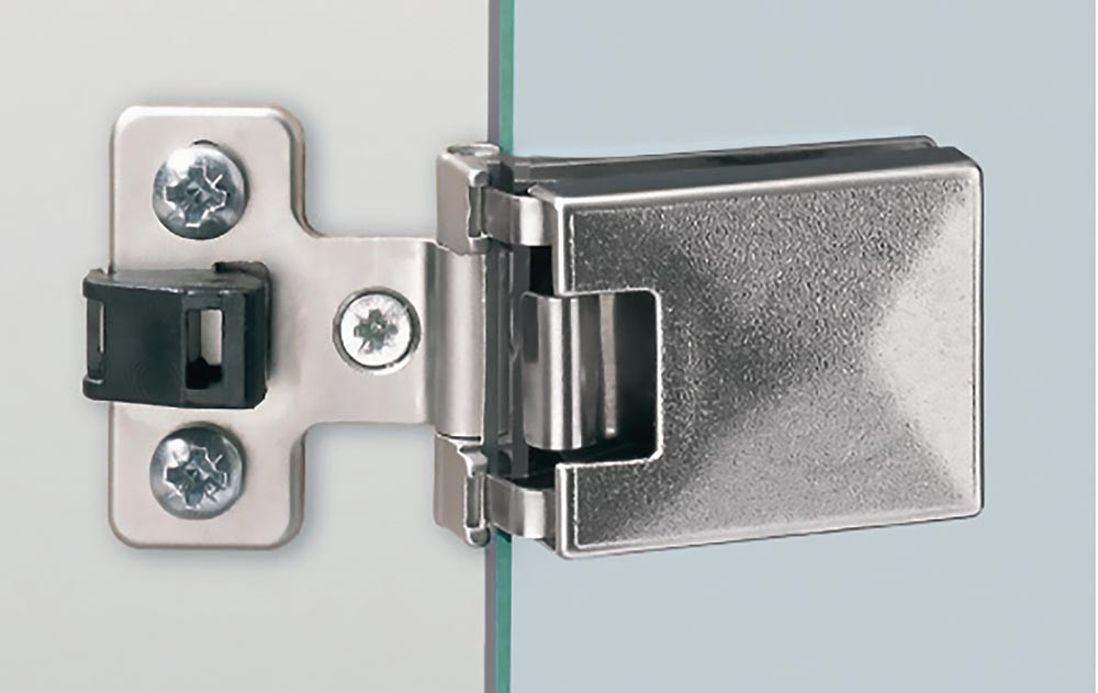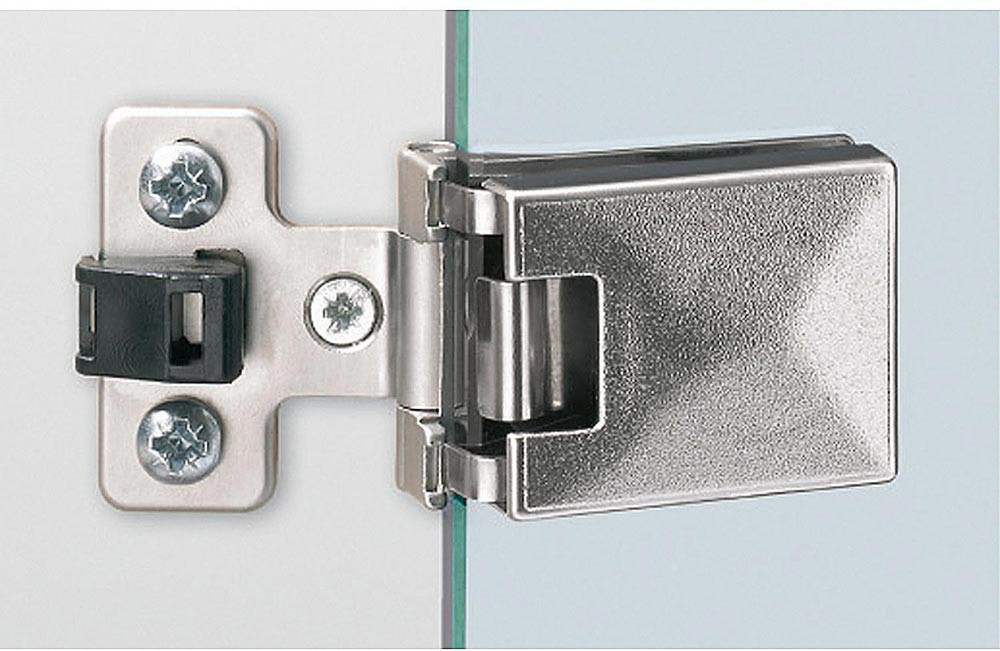 zusätzlich erforderlich für Türhöhe > 1000 mm · mit Zuhaltung für vorliegende Türen · Öffnungswinkel 170° · Glasbohrung ø 12 mm erforderlich · Scharnier inkl. Rutschsicherung zum Aufkleben · Türformat: Höhe = lichte Korpushöhe - 4,4 mm · Mit Glastürgriff: Breite = lichte Korpusbreite - 5 mm · mit sonstigem Griff: Breite = lichte Korpusbreite - 4 mm · Zinkdruckguss vernickelt matt