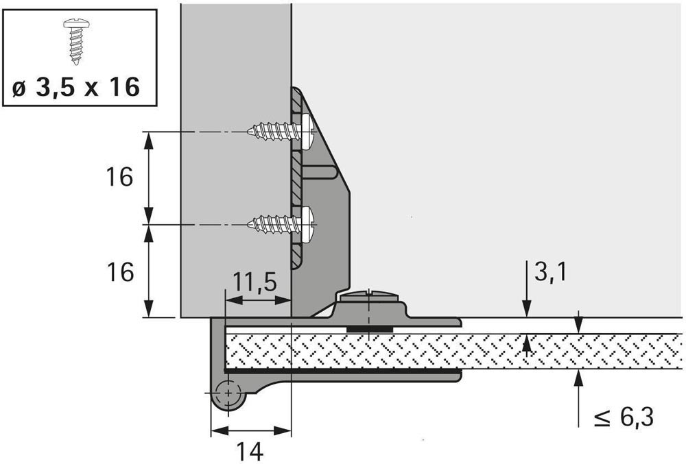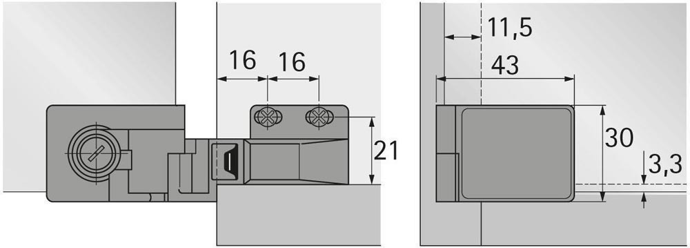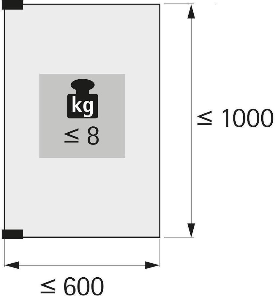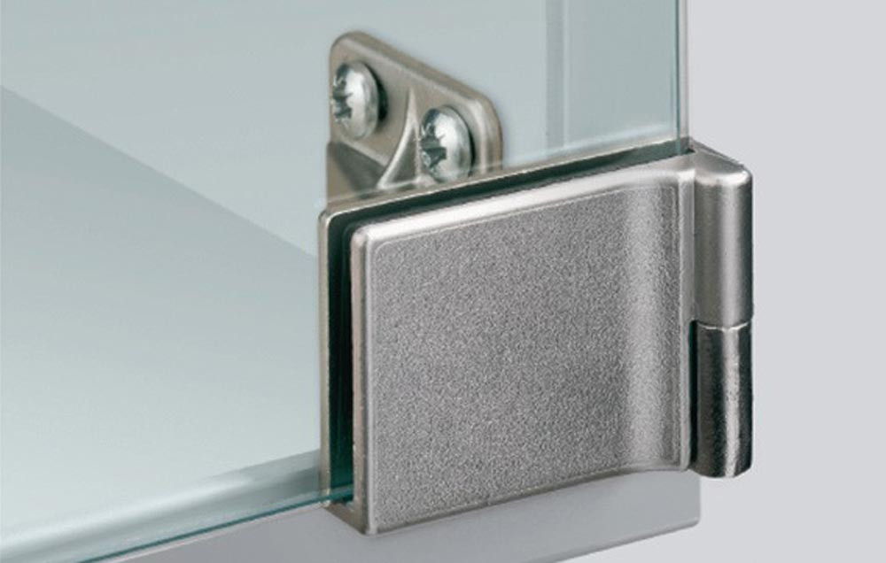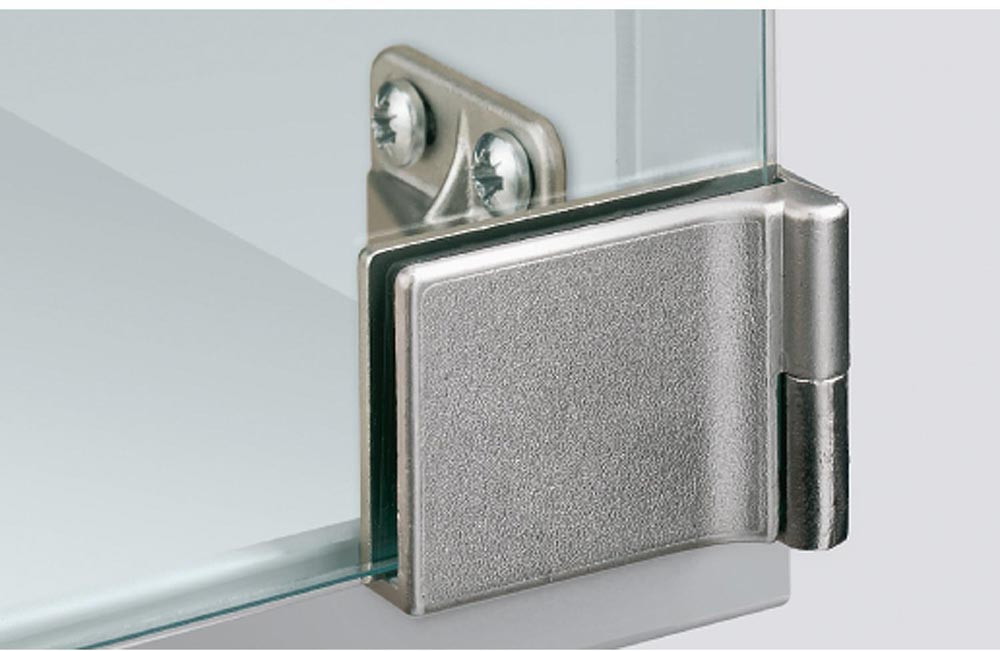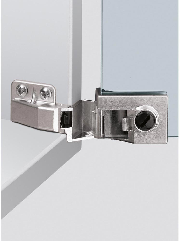 Glastürscharnier mit Zuhaltung für vorliegende Türen · Öffnungswinkel 170° · einfache Montage per Klemmschraube · keine Bohrungen im Glas erforderlich · Scharnier inkl. Rutschsicherung zum Aufkleben · Türformat: - Höhe = lichte Korpushöhe + 6,6 mm · - Breite = lichte Korpusbreite + 23 mm · Zinkdruckguss vernickelt matt