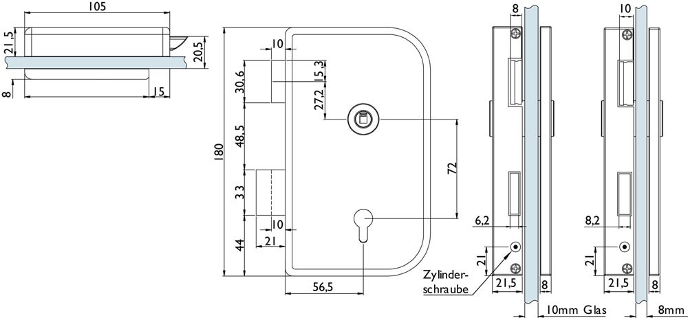 Grundschloss geprüft nach DIN EN 18251 Klasse 3 · Flüsterfalle · 2-geteilte Spezial-Klemmnuss · verschraubte Schlossabdeckungen aus Edelstahl · Zubehörbeutel mit Drückerführung 16 + 18 mm inkl. Abdeckungen in Schlossfarbe · bei diesem Schlosstyp ist die Angabe links oder rechts erforderlich 7 · für 8 mm Glasstärke