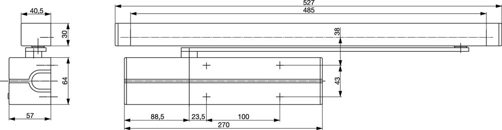 für DC 700 · Gleitschiene mit elektromechanischer Feststellung, 24V DC · für Türbreite bis 1400 mm · geprüft nach DIN EN 1155 · 2 mm höhenverstellbar für Toleranzausgleich · Feststellung stufenlos zwischen 80° und 130° einstellbar · Feststellung überfahrbar, stufenlos · einstellbar · Haltekraft stufenlos einstellbar · Spannungsversorgung 24V DC · Stromaufnahme Feststellelement (24V DC) ca. 75mA · Normalmontage Band- und Bandgegenseite · DIN links und DIN rechts verwendbar · Lieferung ohne Türschließer - Bitte separat bestellen