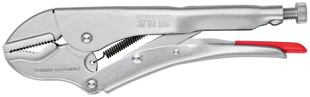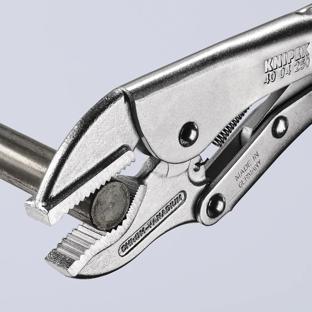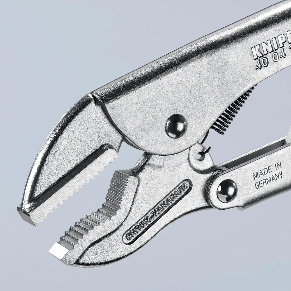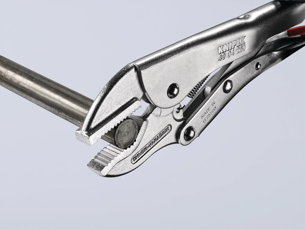 hält Rund-, Profil- und Flachmaterial sicher fest · mit Stellschraube und Lösehebel · Einhandbedienung · hoher Spanndruck durch Kniehebelübersetzung · Zangenkörper: Walzstahl, hochfest · Greifbacken: Chrom-Vanadin-Elektrostahl, geschmiedet