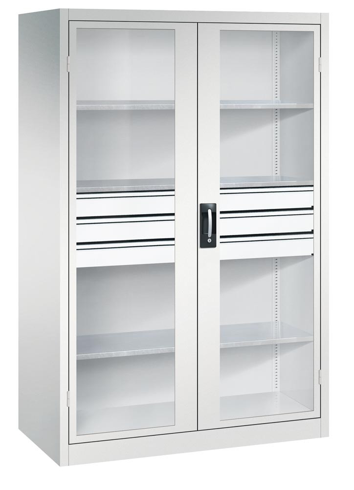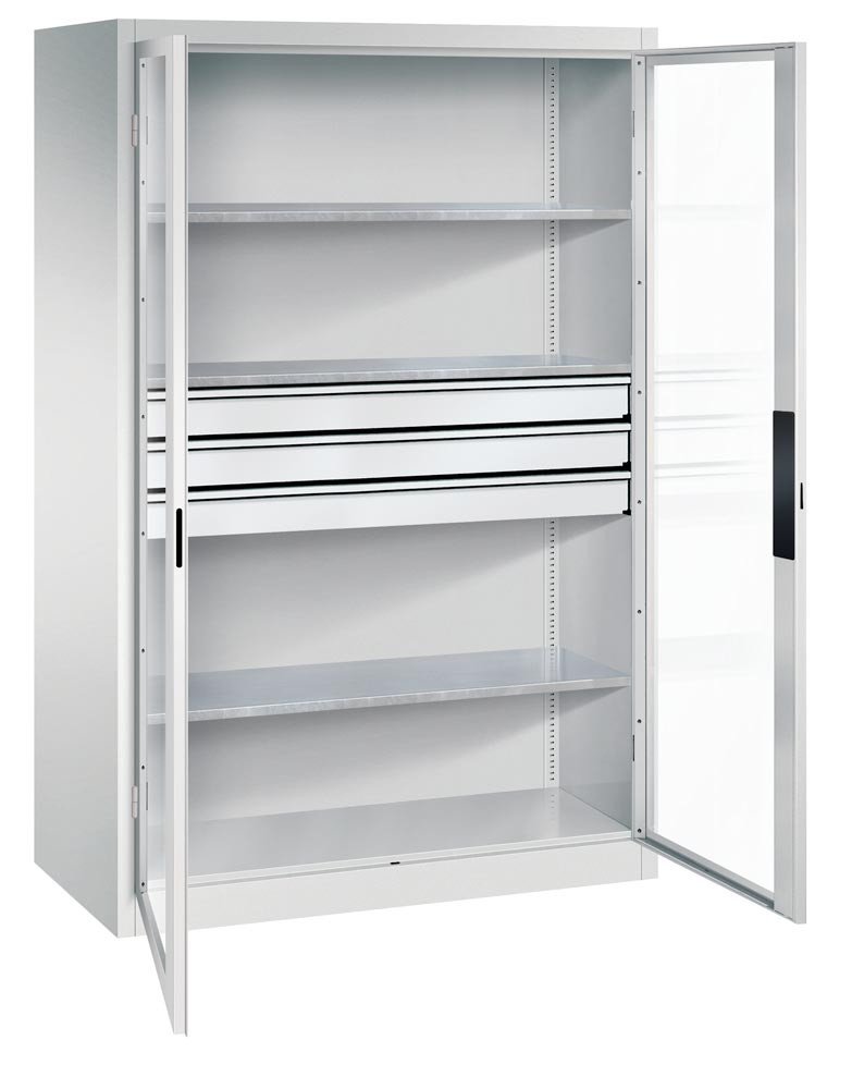 Großraum-Werkzeugschrank mit Sichfensterflügeltüren, 3 Schubladen unten, 4 Verstellböden, BxTxH 930x600x1950 mm, RAL 7035 E1979521