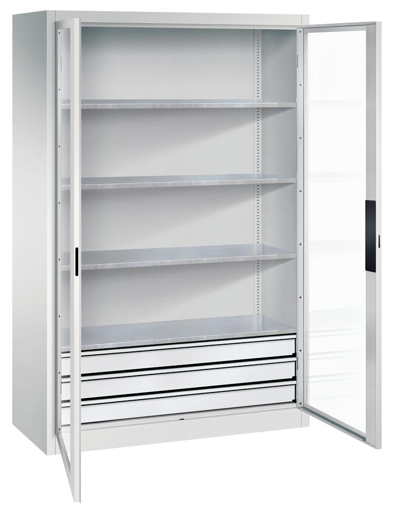 Großraum-Werkzeugschrank mit Sichfensterflügeltüren, 3 Schubladen unten, 4 Verstellböden, BxTxH 930x600x1950 mm, RAL 7035 E1979521