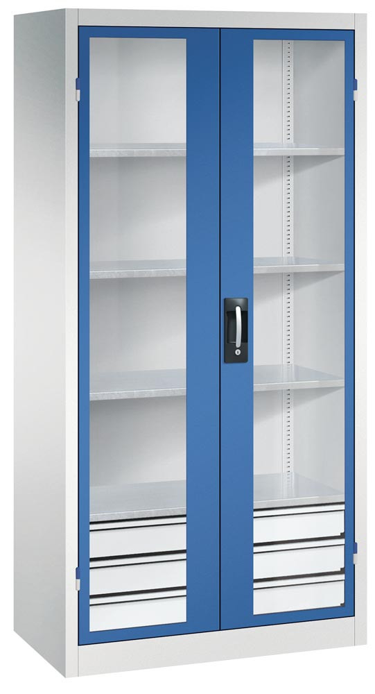 Großraum-Werkzeugschrank mit Sichfensterflügeltüren, 3 Schubladen unten, 4 Verstellböden, BxTxH 930x500x1950 mm, RAL 7035/5010 E1979520