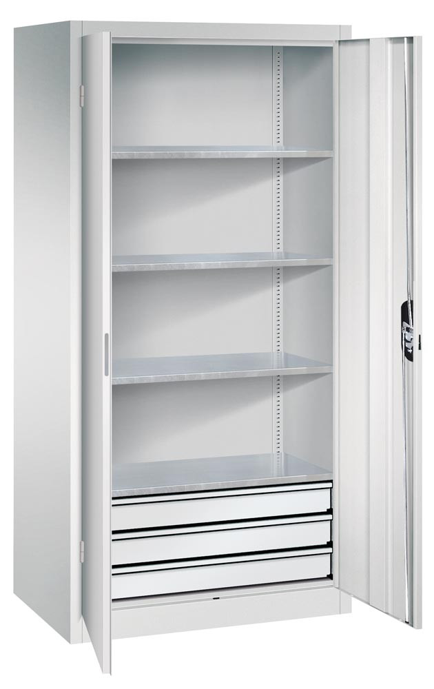 Großraum-Werkzeugschrank mit Vollblech-Flügeltüren, 3 Schubladen unten, 4 Verstellböden, BxTxH 930x500x1950 mm, RAL 7035 E1985077