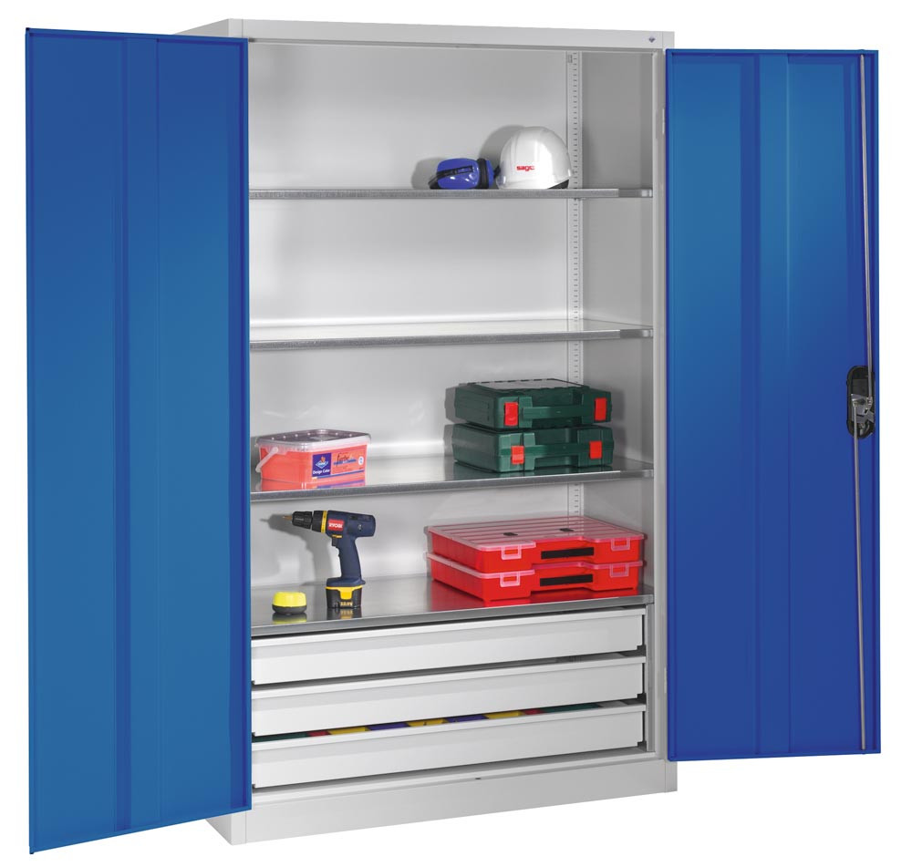 Großraum-Werkzeugschrank mit Vollblech-Flügeltüren, 3 Schubladen unten, 4 Verstellböden, BxTxH 930x500x1950 mm, RAL 7035/5010 E1985078