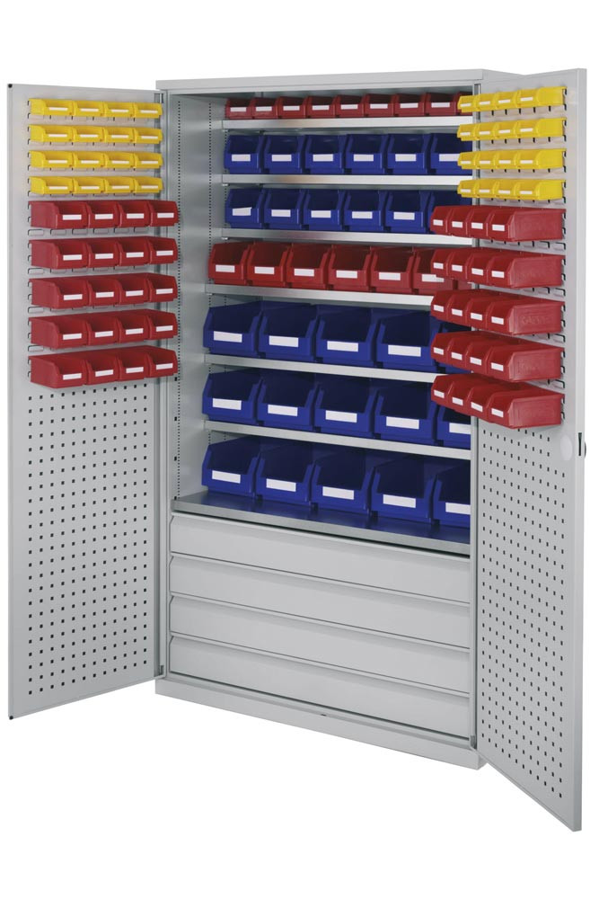 Großraumschrank, Türen mit Lochplatten, Kästen: 15xGr. 4, 7xGr. 5, 14xGr. 6, 10xGr. 7, 4 Schubladen unten, BxTxH 1130x590x1950 mm