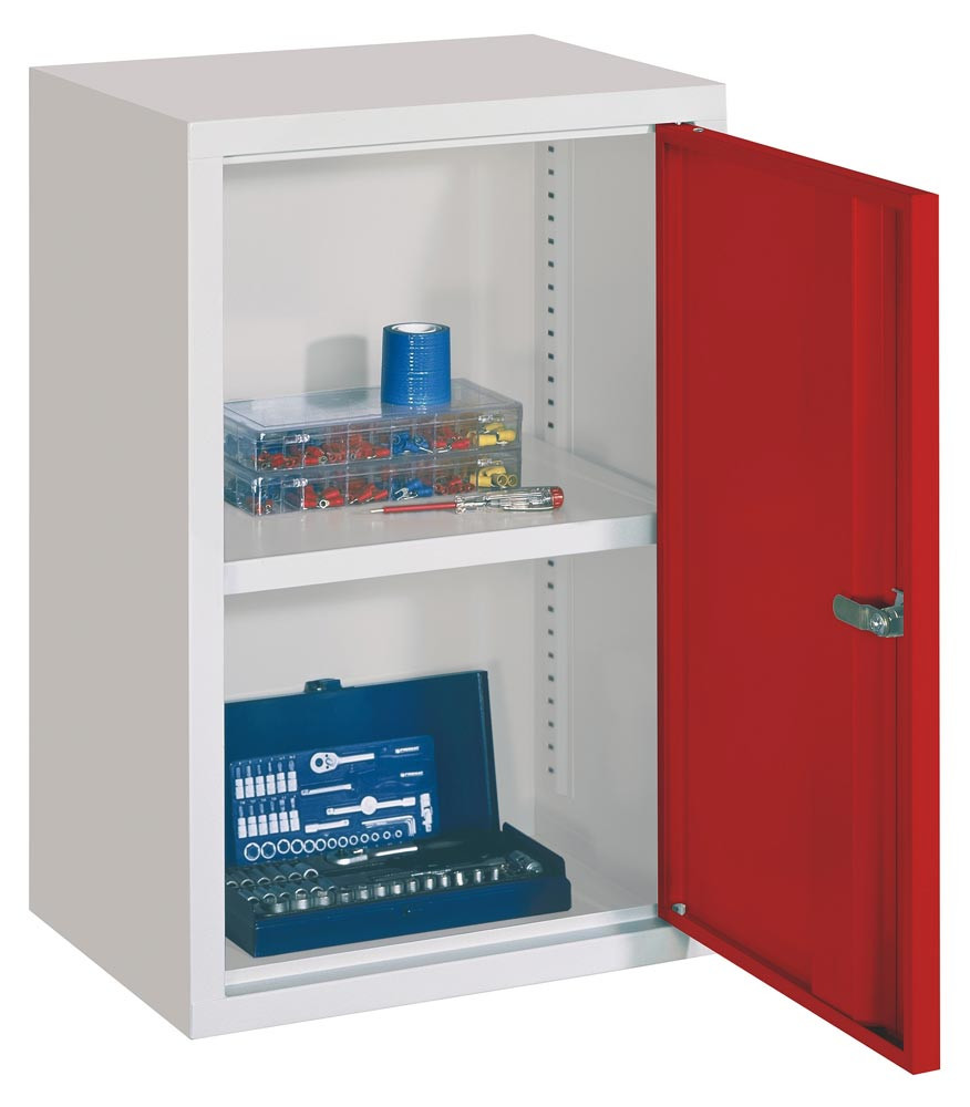 ∙ Stabile, pulverbeschichtete Stahlblechkonstruktion ∙ Türen mit Verstärkungstasche, durch Zylinderschloss verschließbar ∙ 1 in Schrankfarbe pulverbeschichteter Fachboden gehört zum Lieferumfang ∙ Fachboden im Raster von 17 mm höhenverstellbar
