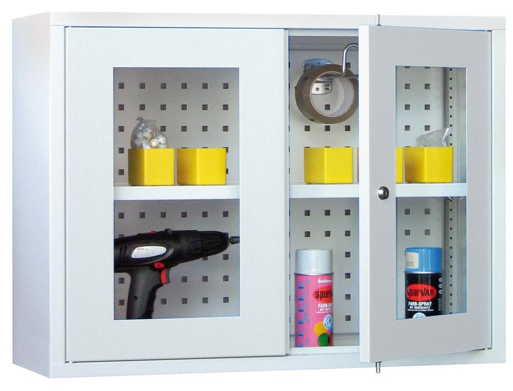 Hängeschrank, 2 Sichtfenstertüren, Rückwand gelocht, 1 verstellbarer Boden, Zylinderschloss, BxTxH 800x300x600 mm, RAL 7035