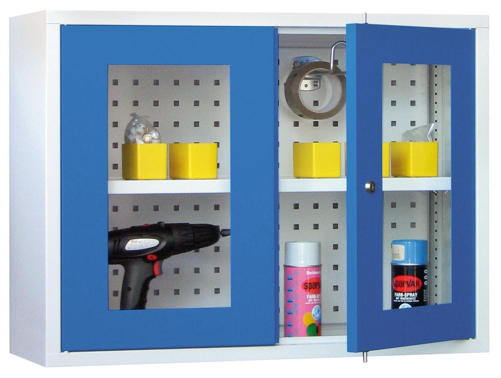 Hängeschrank, 2 Sichtfenstertüren, Rückwand gelocht, 1 verstellbarer Boden, Zylinderschloss, BxTxH 800x300x600 mm, RAL 7035/5015