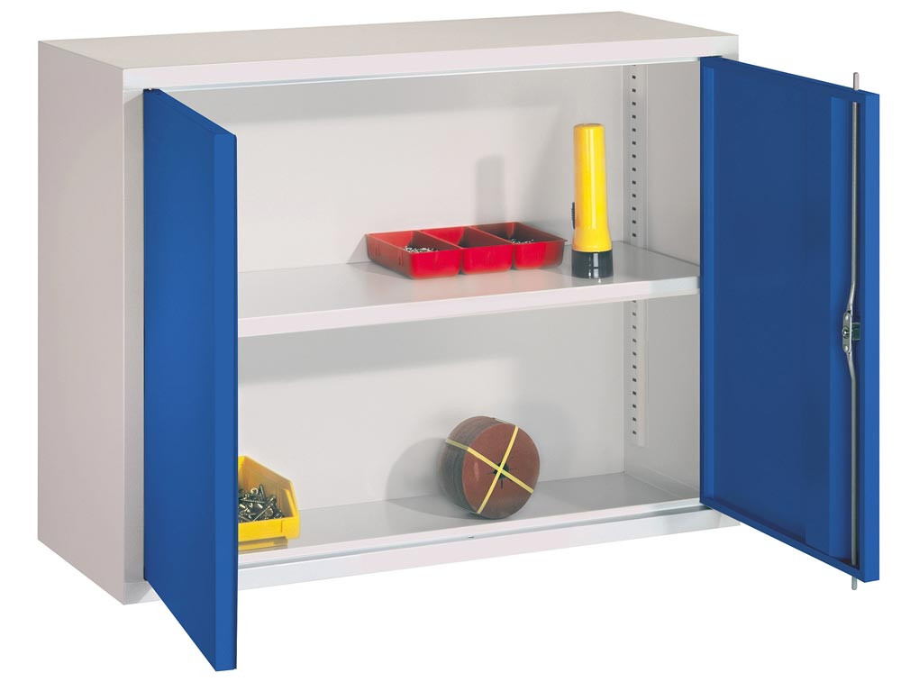 ∙ Stabile, pulverbeschichtete Stahlblechkonstruktion ∙ Türen mit Verstärkungstasche, durch Zylinderschloss verschließbar ∙ 1 in Schrankfarbe pulverbeschichteter Fachboden gehört zum Lieferumfang ∙ Fachboden im Raster von 17 mm höhenverstellbar