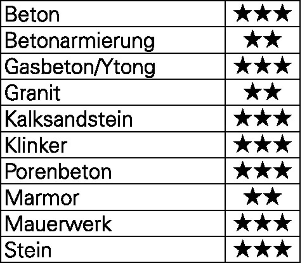 Anwendungsbereiche: Beton, Betonarmierung, Mauerwerk, Naturstein, Kalksandstein, Fliesen, Marmor, Klinker