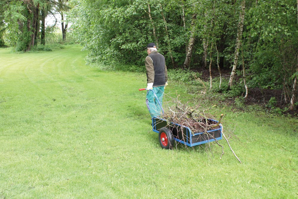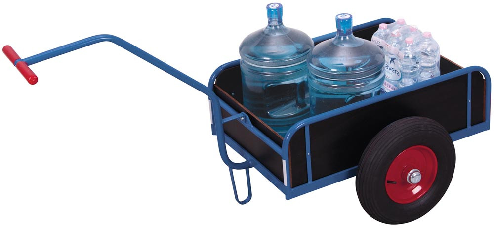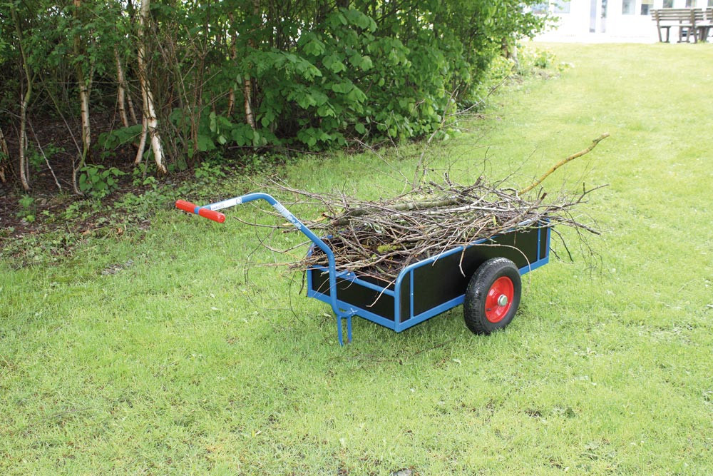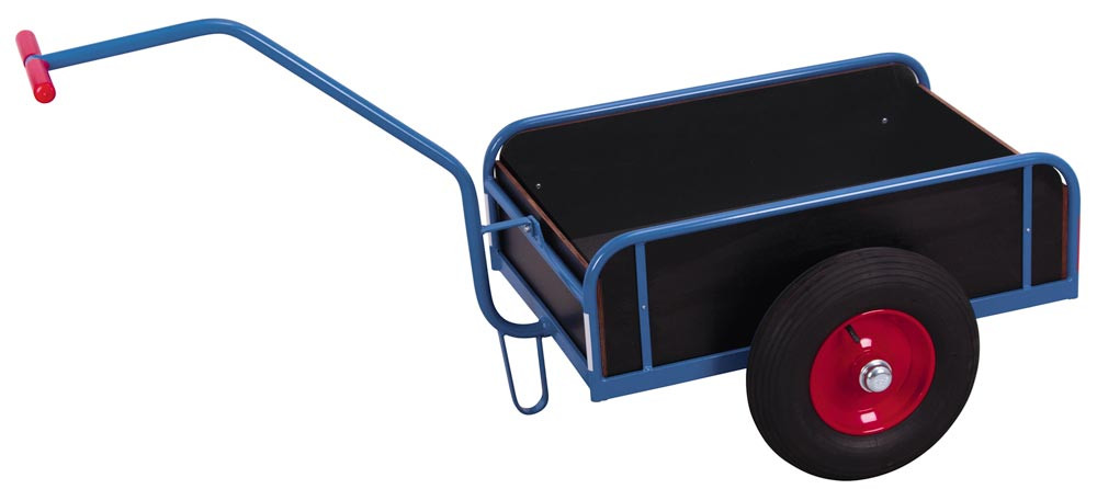· Geschweißter Profilstahlrahmen · Pulverbeschichtet RAL 5010 enzianblau · Schlag- und kratzfest · Ladefläche mit rutschsicherer Siebdruckplatte aus wasserfest verleimtem Sperrholz · Sicherheitsreflektoren · Geländer- bzw. Bordwandhöhe 220 mm · Handdeichsel · Schutzkappen am Griff · Luftbereifung · Stahlfelge mit Kugellager