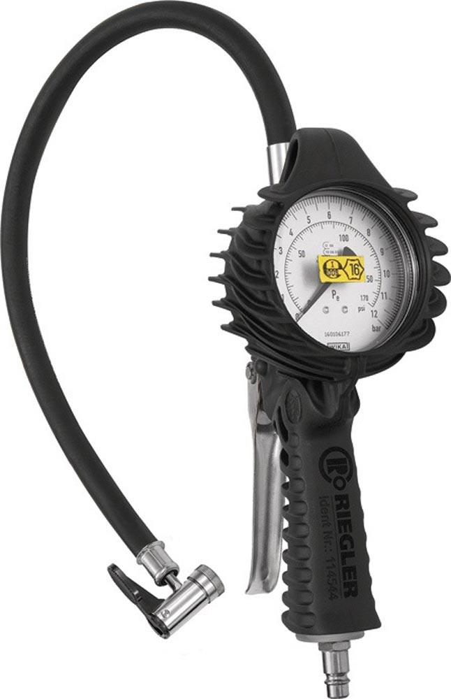 Standardausführung · robuster Standard-Handreifenfüllmesser mit vollgummierter Schutzhülle · Druckmanometer mit bar- und psi-Anzeige · Schlauchlänge: 50 cm · Schlauchanschluss G 1/4, drehbar
