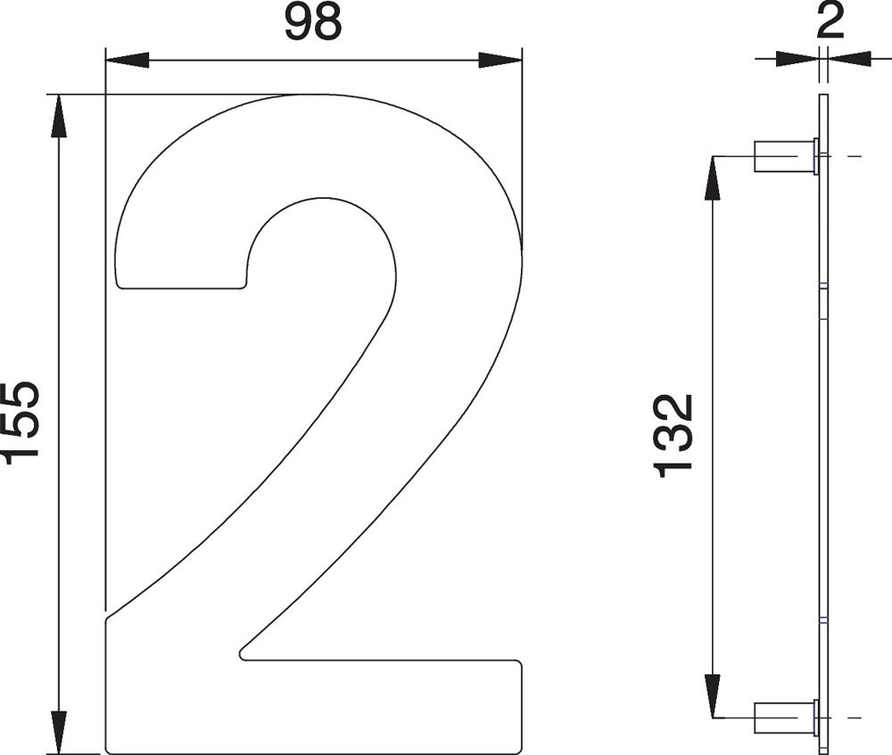Hausnummer Ziffer 2 Edelstahl matt 155 mm Breite 98 mm