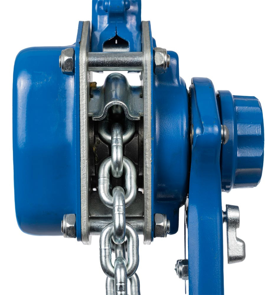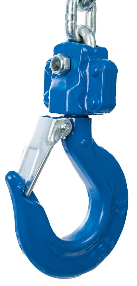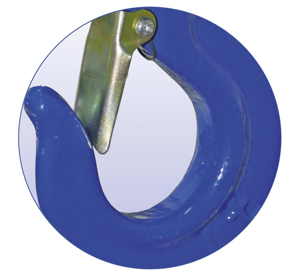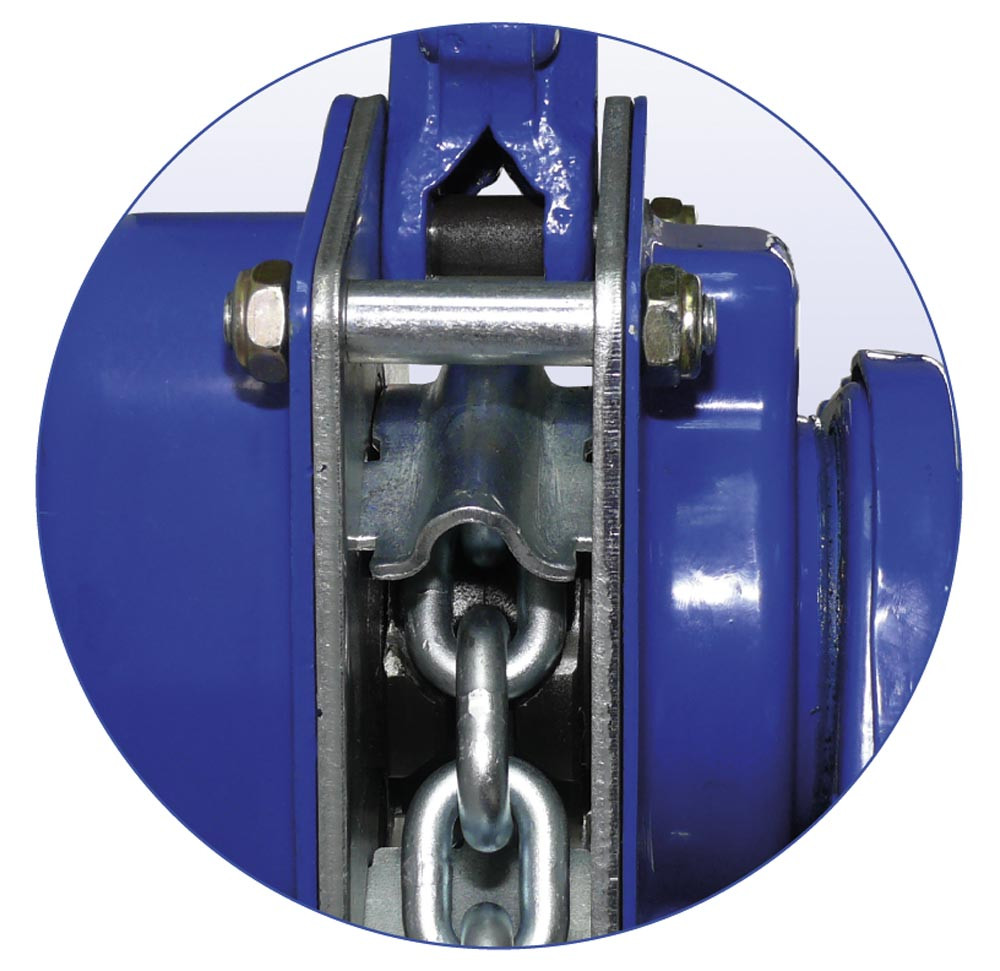∙ Verzinkte Kettenführung ∙ 1,5 m lange, galvanisierte, vergütete Lastkette nach EN 818-7-T ∙ Alle Schrauben, Muttern und Bolzen galvanisch verzinkt ∙ Trag- und Lasthaken aus wärmebehandeltem Vergütungsstahl geschmiedet, mit Hakensicherung ∙ Freilauf zum schnellen Durchziehen der Kette im unbelasteten Zustand