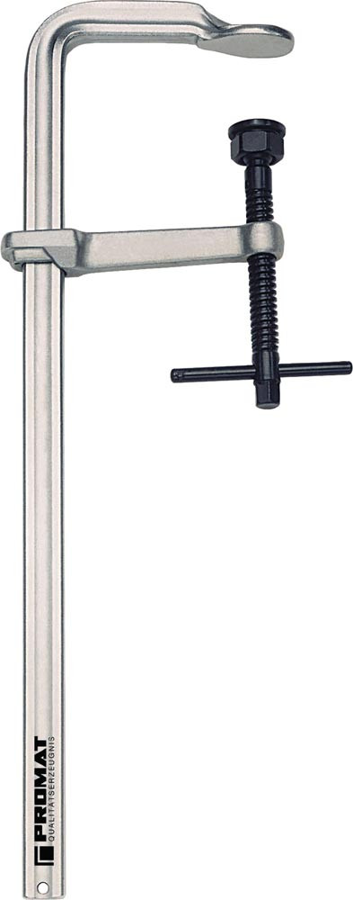 Festbügel aus kaltgezogenem Profilstahl · Gleitbügel gesenkgeschmiedet · vergütet · verzinkt · Spindel mit Trapezgewinde und SW 17 am Spindelende · beweglicher (bis 35°) Druckplatte und Knebelgriff für schwere Beanspruchung beim Spannen von Werkstücken im Stahlbau · Schlossereien · Holzverleimungen · Maschinenbau usw. · für Spannkräfte von 12 kN bei 150 mm Spannweite