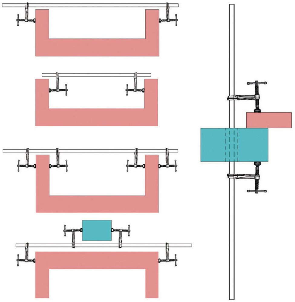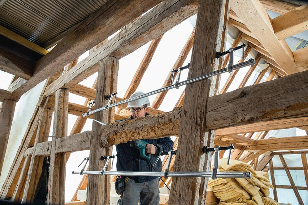 variable Hochleistungsschraubzwinge mit Schiene aus kalt gezogenem und verzinktem Profil · 2 Gleitbügel aus Vergütungsstahl geschmiedet · werkzeuglos zum Spreizen umsteckbar · die Zwinge kann durch Öffnungen im Werkstück geschoben werden · Spannkraft bis zu 6500 N (bei Spannweite bis 2000 mm) bzw. 9000 N (bei Spannweite 3000 mm) · hitzebeständige 35° schwenkbare Spezialdruckplatte (bei Spannweite bis 2000 mm) · mit Sinterstahleinlage bei Spannweite 3000 mm