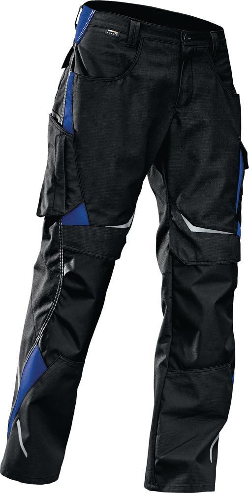 65% Polyester / 35% Baumwolle, ca. 260 g/m² · ergonomische Linienführung für mehr Bewegungsfreiheit · 2 Gesäßtaschen mit CORDURA®-Verstärkung, rechts mit Patte und Klette verschließbar · 1 Schenkeltasche links mit CORDURA®-Verstärkung, mit Patte und Klette verschließbar · zusätzliche Reißverschlusstasche · elastischer Bundeinsatz · vorgeformtes Knie mit Bewegungszone · Belastungspunkte mit Riegel gesichert · Knieschutztaschen aus CORDURA® von oben erreichbar und mit Patten und Klette verschließbar