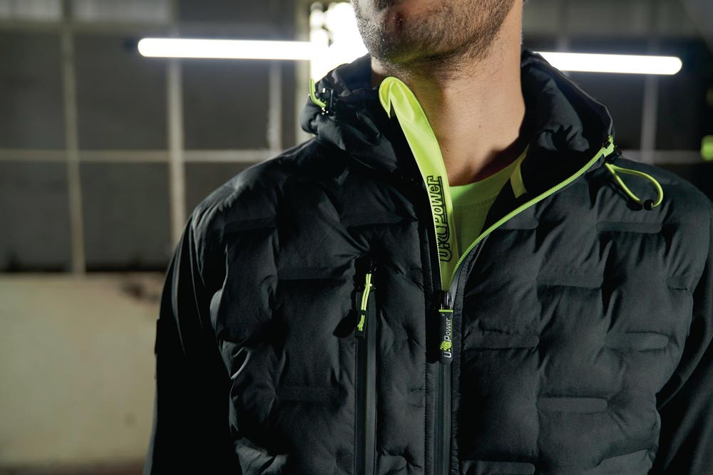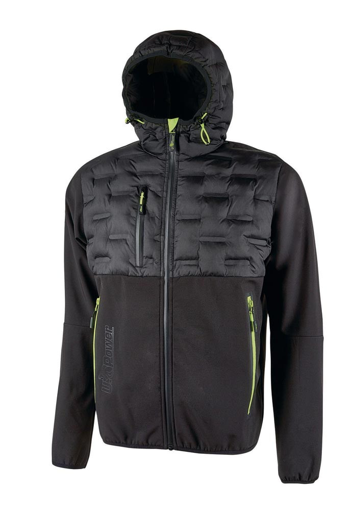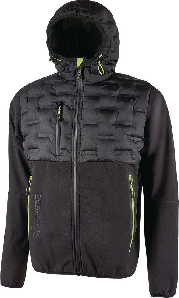 96% Polyester / 4% Elastan +TPU Membrane, ca. 320 g/m² · extrem vielseitige, wasserabweisende, atmungsaktive und winddichte Hybridjacke · wasserdichter Reißverschluss · feste und verstellbare Kapuze · elastische Bündchen · Innenfutter bestehend aus Nylon und Microfleece · ausgestattet mit zwei großen Fronttaschen mit Fluo - Reißverschluss und einer Tasche auf der Brust, die mit wasserdichtem Reißverschluss verschlossen ist · zwei große Innentaschen