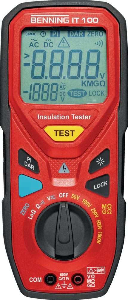 für Isolations- und Niederohmmessungen an elektrischen Anlagen, Geräten, Leitungen, Motoren und Generatoren · 4-stellig, beleuchtete LCD-Anzeige (9.999 Punkte) · rote LED für Prüf-/ Fremdspannung · automatische Entladung von kapazitiven Spannungen · Nullabgleich der Messleitungen · Lock-Funktion für kontinuierliche Isolations- und Niederohmmessung · integrierter Sicherungstest · Testverriegelung bei Gegenspannung · Messkategorie CAT IV 600 V