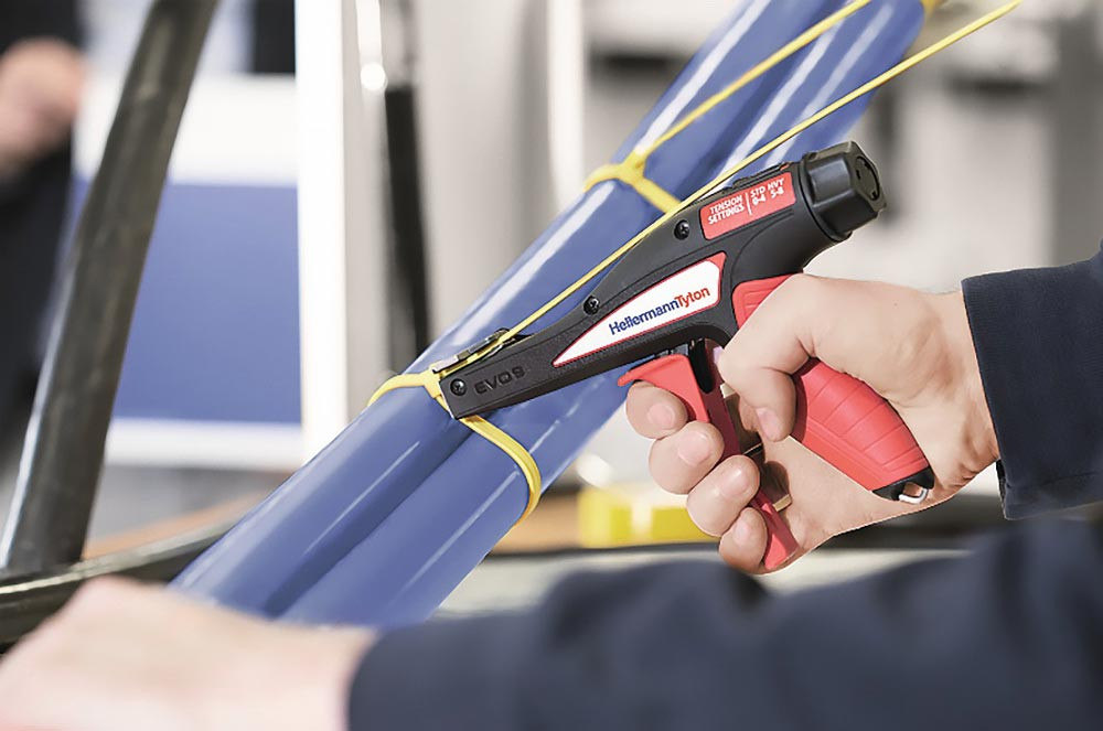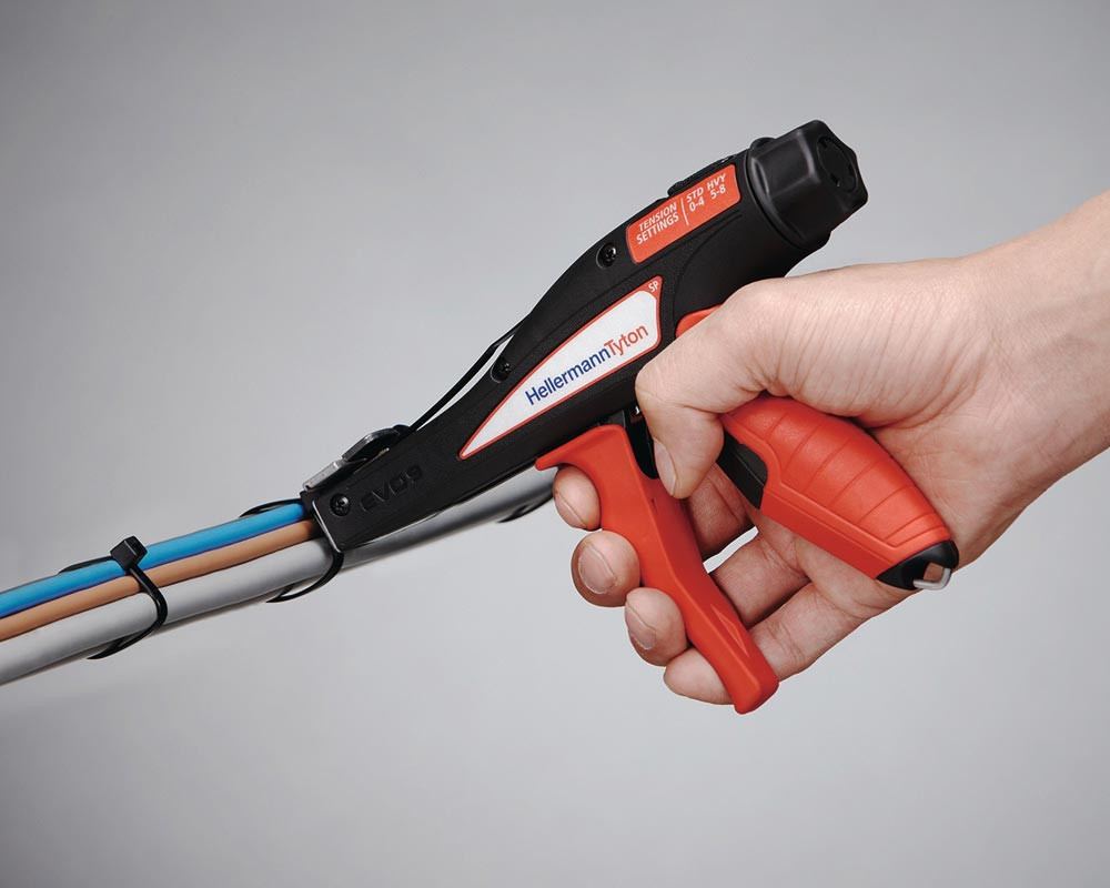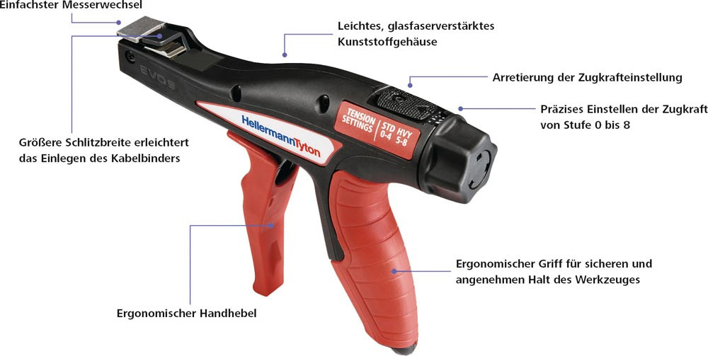 leichtes, glasfaserverstärktes Kunststoffgehäuse · zum Spannen und automatischen Abschneiden von innen-verzahnten oder außenverzahnten Kabelbindern mit geringem Kraftaufwand (TLC- Technologie) · schnelle und leichte Regulierung der gewünschten Zugkraft · nur für Polyamid-Kabelbinder · Ersatzschneidmesser lieferbar