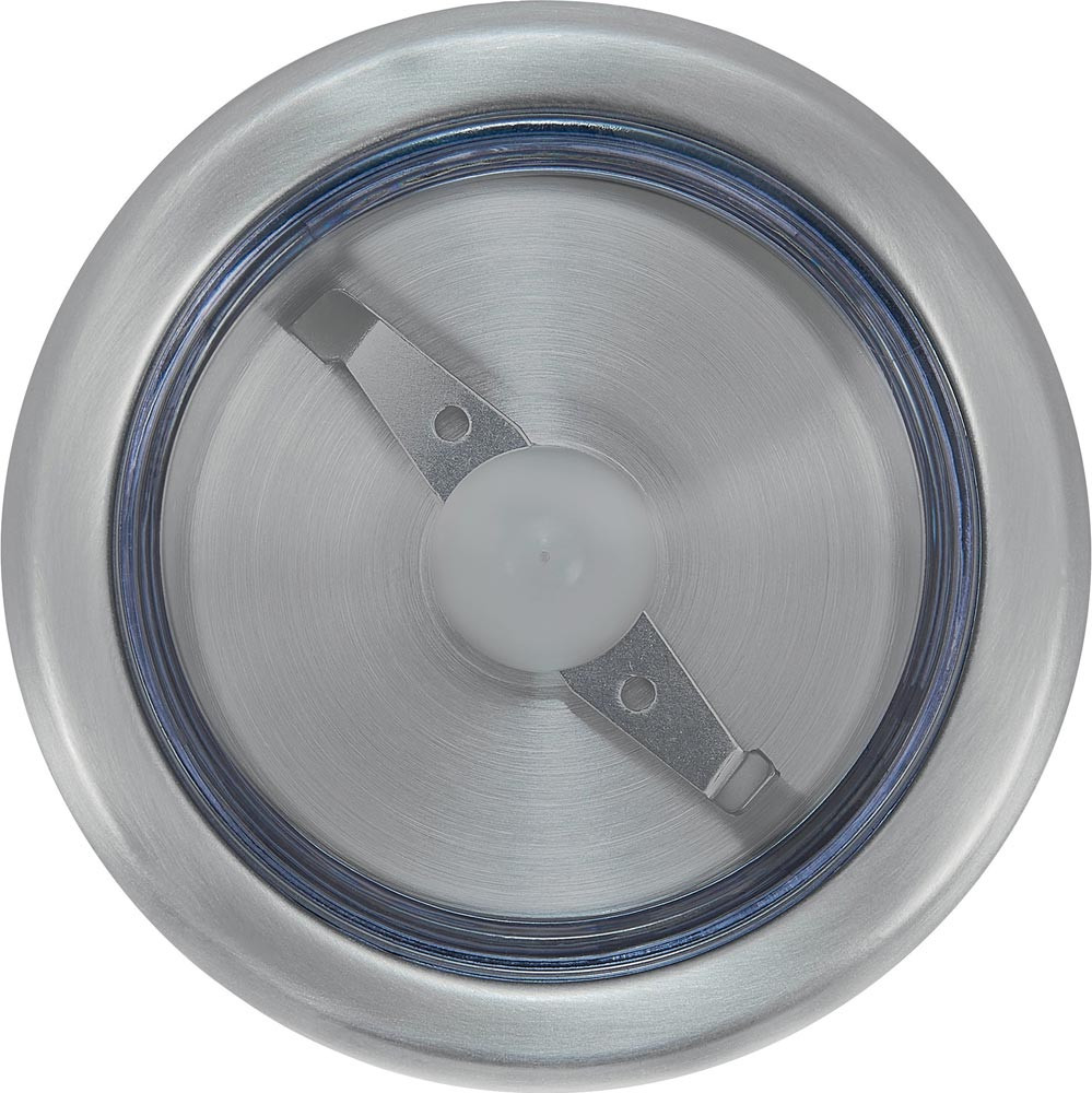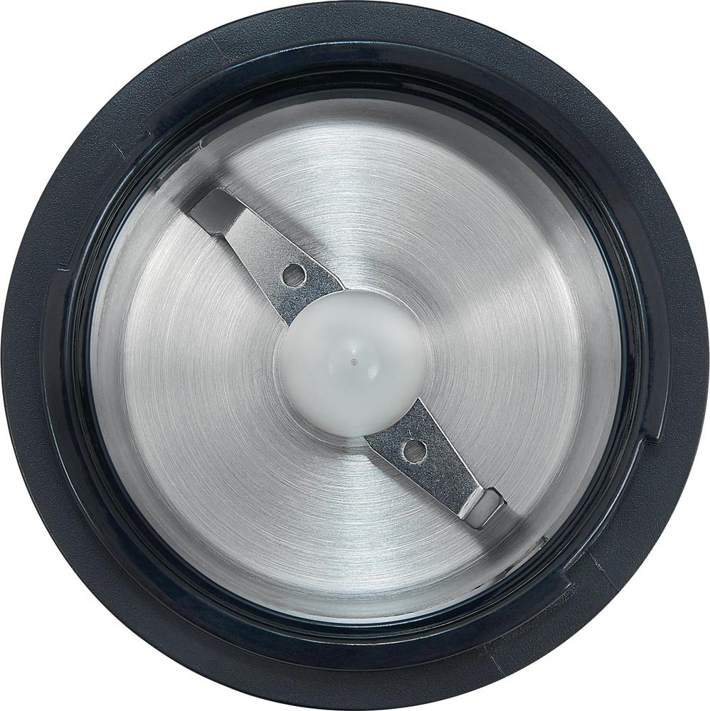 Mahlgrad kann individuell durch Drucktaste reguliert werden · Gehäuse und Klingen aus hochwertigem Edelstahl · Sicherheitsverriegelung · Kabelaufwicklung · Kabellänge 1 m · Sichtfenster im Deckel zur einfachen Kontrolle des Mahlgrades · H.166 x B.98 x T.98 mm