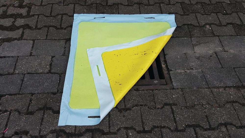 aus Polyurethan · auf der Unterseite stark klebend · die Oberseite ist mit einer Polyester-Silicon-Schicht versehen, zur Verbesserung von Schutz und mechanischer Widerstandsfähigkeit · auf beiden Seiten mit 2 Griffen versehen um den Einsatz spürbar zu erleichtern · kann gereinigt und wieder verwendet werden · inkl. Transport- und Lagerbox